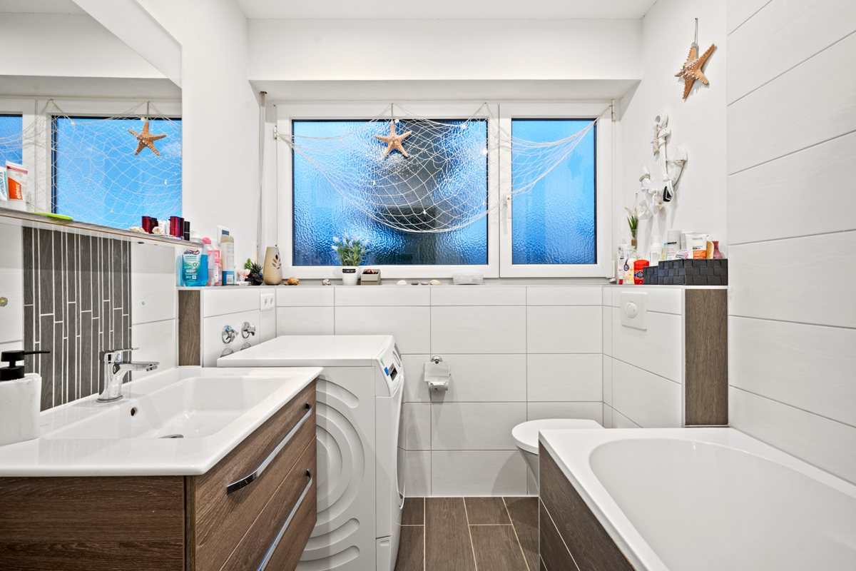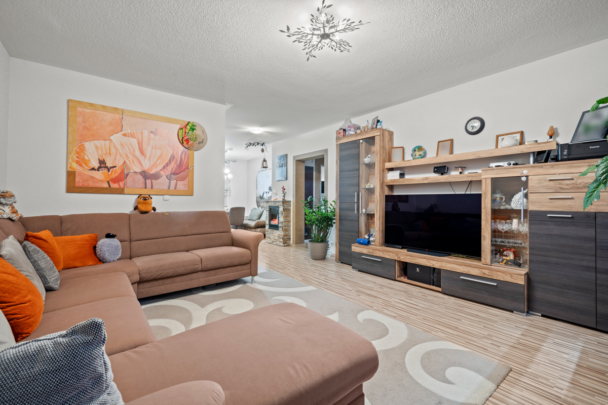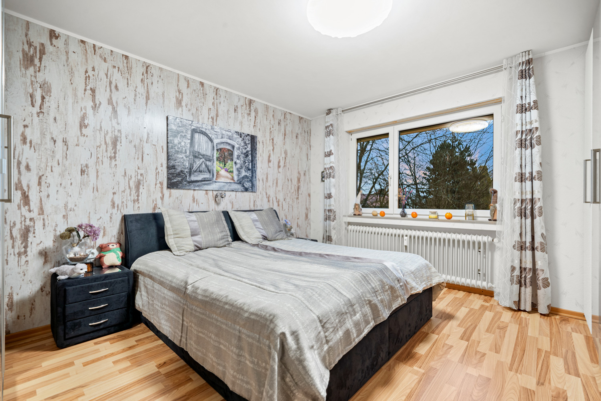 Die Wohnräume sind mit einem sehr schönen Laminatboden ausgestattet, Küche und Bad punkten mit hochwertigen Fliesen. Die großen Kunststofffenster ermöglichen rundum einen Blick auf das gewachsene Grundstück mit altem Baumbestand, der im Sommer zusätzlich Privatsphäre und Sonnenschutz bietet.