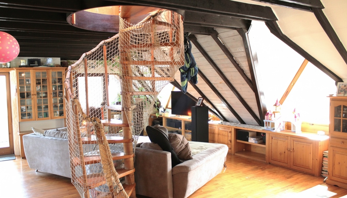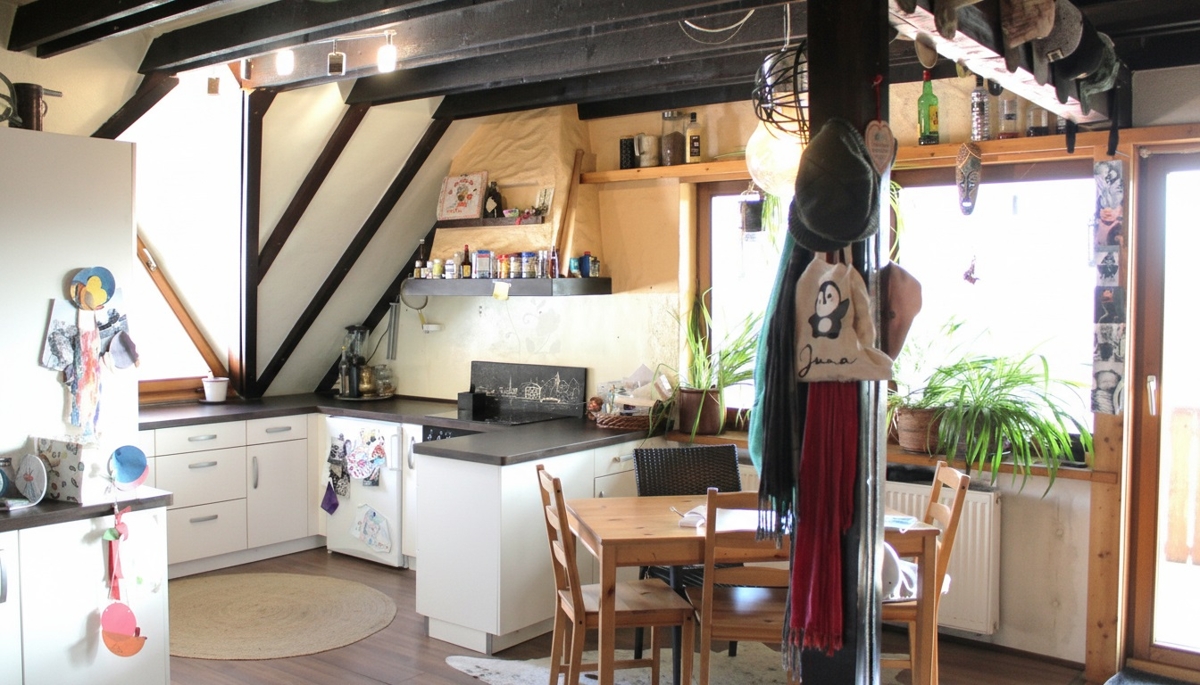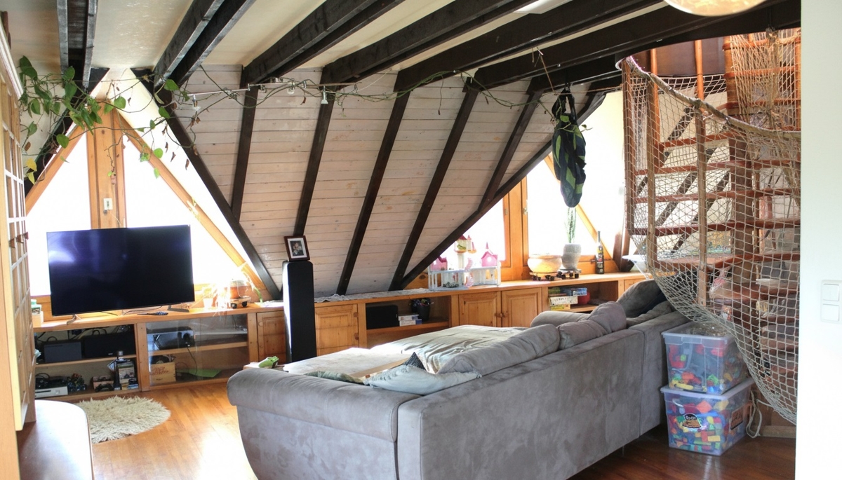 Die attraktive Maisonette liegt im 1. Obergeschoss und im Dachgeschoss eines Zweifamilienhauses am Waldrand des Ortes und bietet großzügiges und offenes Wohnen auf zwei Ebenen. Die offenen Balken und gemütliche Dachschrägen verleihen der Wohnung eine besonders gemütliche Atmosphäre. Großzügige Fensterflächen sorgen für helle und freundliche Räume und bieten einen attraktiven Ausblick ins Grüne. In der offenen Küche mit anschließendem Wohn- und Essbereich findet sich ausreichend Platz für einen großen Esstisch für die ganze Familie. Zusätzlich bietet das gemütliche Wohnzimmer Platz für eine gemütliche Sofalandschaft für entspannte Stunden mit Familie und Freunden. Auf dem großzügigen, überdachten Balkon lässt sich in der warmen Jahreszeit ein wunderbarer Ausblick über die Dächer von Stahringen auf die sanfte Hügellandschaft des Hegaus genießen. Im unteren Bereich befindet sich neben dem großen Badezimmer mit Wannenbad auch ein kleineres Arbeits- oder Kinderzimmer. Weitere Rückzugsmöglichkeiten befinden sich im oberen Geschoss der Wohnung, die durch eine Holzwendeltreppe erreicht werden können. Neben einem großen und hellem Dachstudio mit Echtholzparkett, bodentiefen Glasfenstern und eigenem Balkon befindet sich hier auch noch ein kleines Durchgangszimmer, ein schönes Erkerzimmer und ein weiteres Badezimmer mit WC und Dusche.Lagebeschreibung: