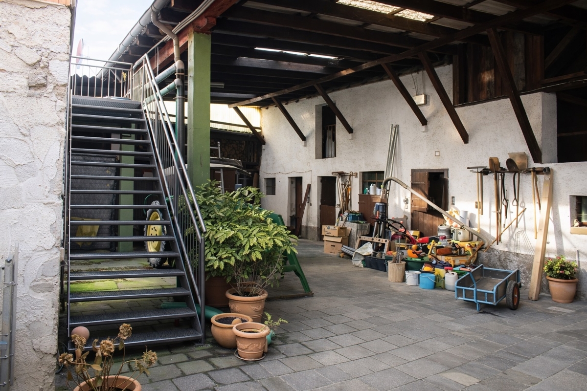 Im rückwärtigen Grundstücksbereich befinden sich ehemalige landwirtschaftliche Nebengebäude, darunter Stallungen, Geräteschuppen, ein Heuboden sowie weitere Wirtschaftsflächen. Die Nebengebäude wurden entlang der Grundstücksgrenzen errichtet und stellen einen rechtmäßig entstandenen baulichen Bestand dar.