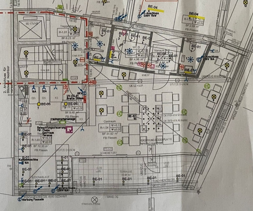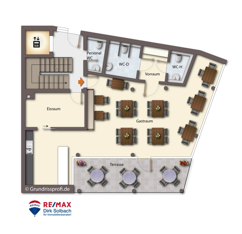 Die Einheit verfügt über eine Verkaufsfläche von ca. 74 qm mit ca. 27 Sitzplätzen, eine Terrasse mit ca. 16 qm für ca. 12 Sitzplätze, einen Eisraum mit ca. 9 qm ein Herren-WC , ein Damen-WC, ein WC für Mitarbeiter und einen Kellerraum.