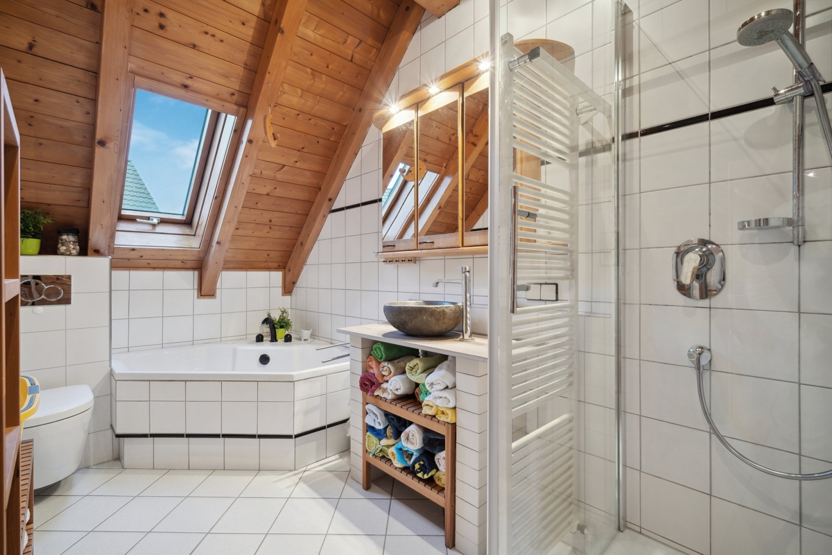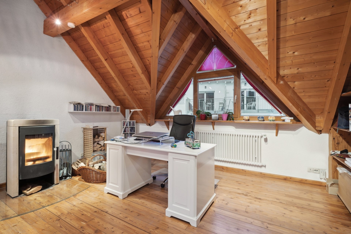Im D.G. ist ein riesiges Wohnzimmer mit Schwedenofen, ein weiteres Zimmer und ein großes Bad mit Wanne und Dusche.