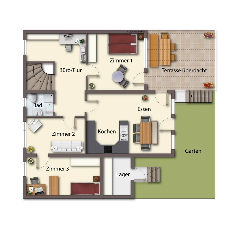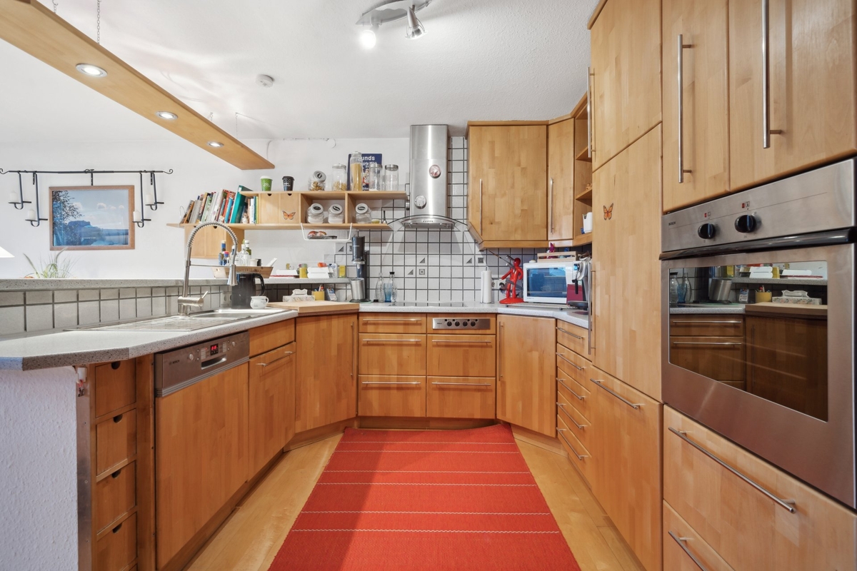 Im 1. O.G. befindet sich ein großer Koch-/Essbereich mit angrenzender überdachter Terrasse, Zugang zum Garten, 3 Zimmer, ein schönes Bad und ein Flur-/Bürobereich.