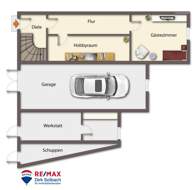 Im Erdgeschoß befindet sich neben der Diele mit Garderobe, ein Gästezimmer, ein Hobbyraum, eine Doppelgarage, eine Werkstatt mit Schuppen und ein angrenzender Gartenteil.